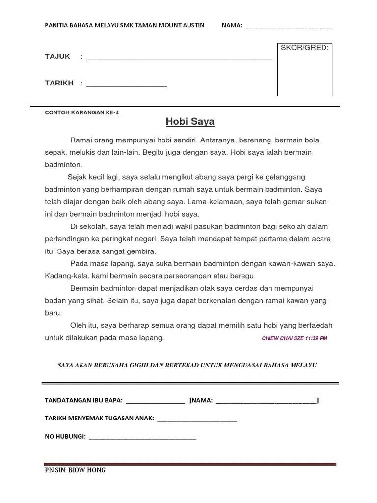 Bahasa melayu (bm) grade level: karangan hobi saya. Bahasa melayu (bm) grade level:
